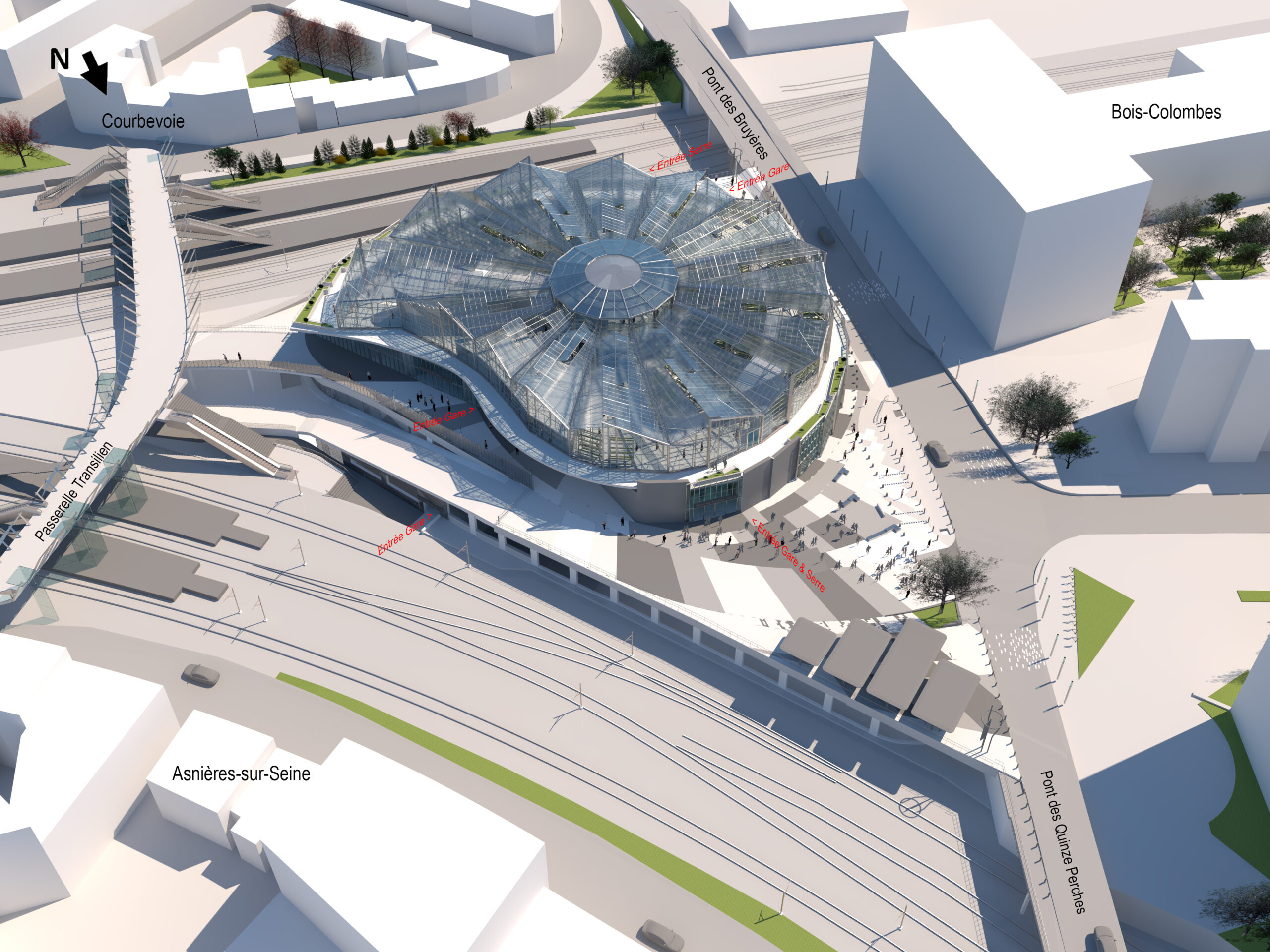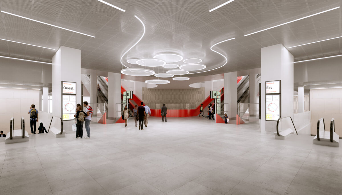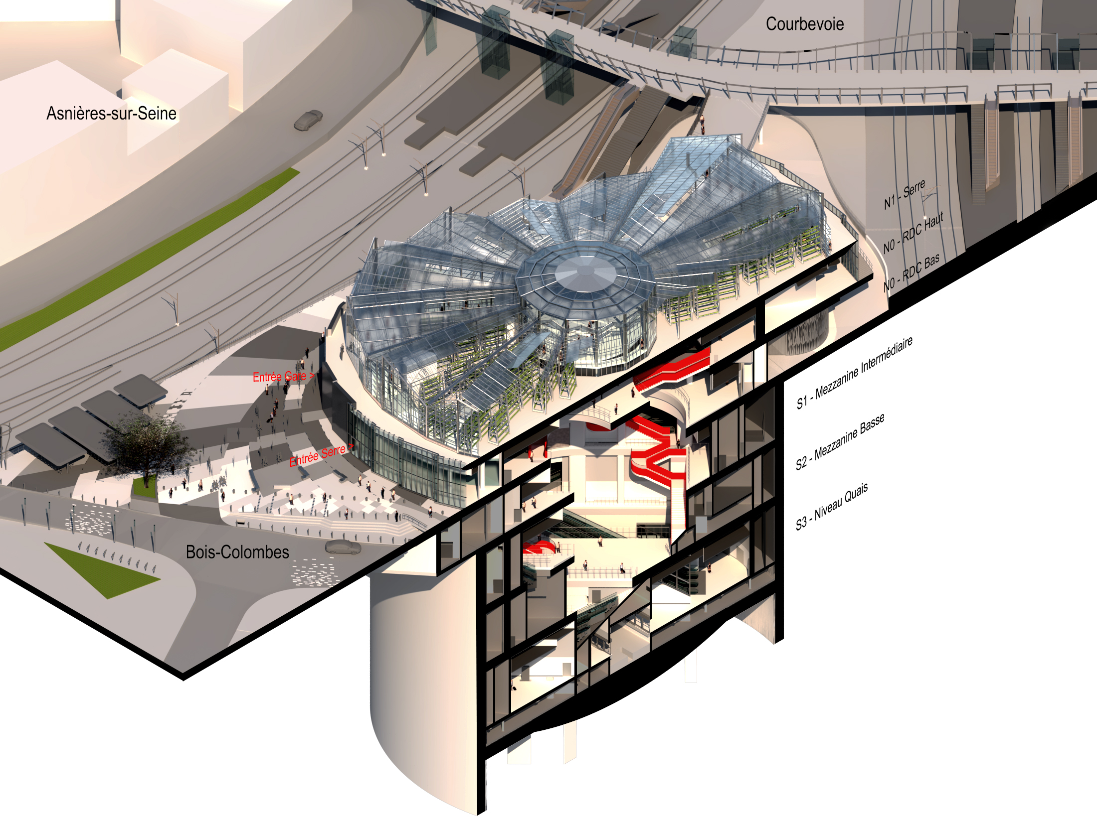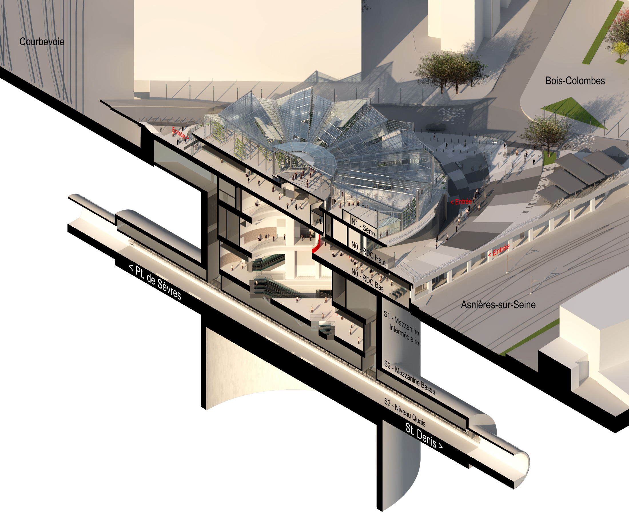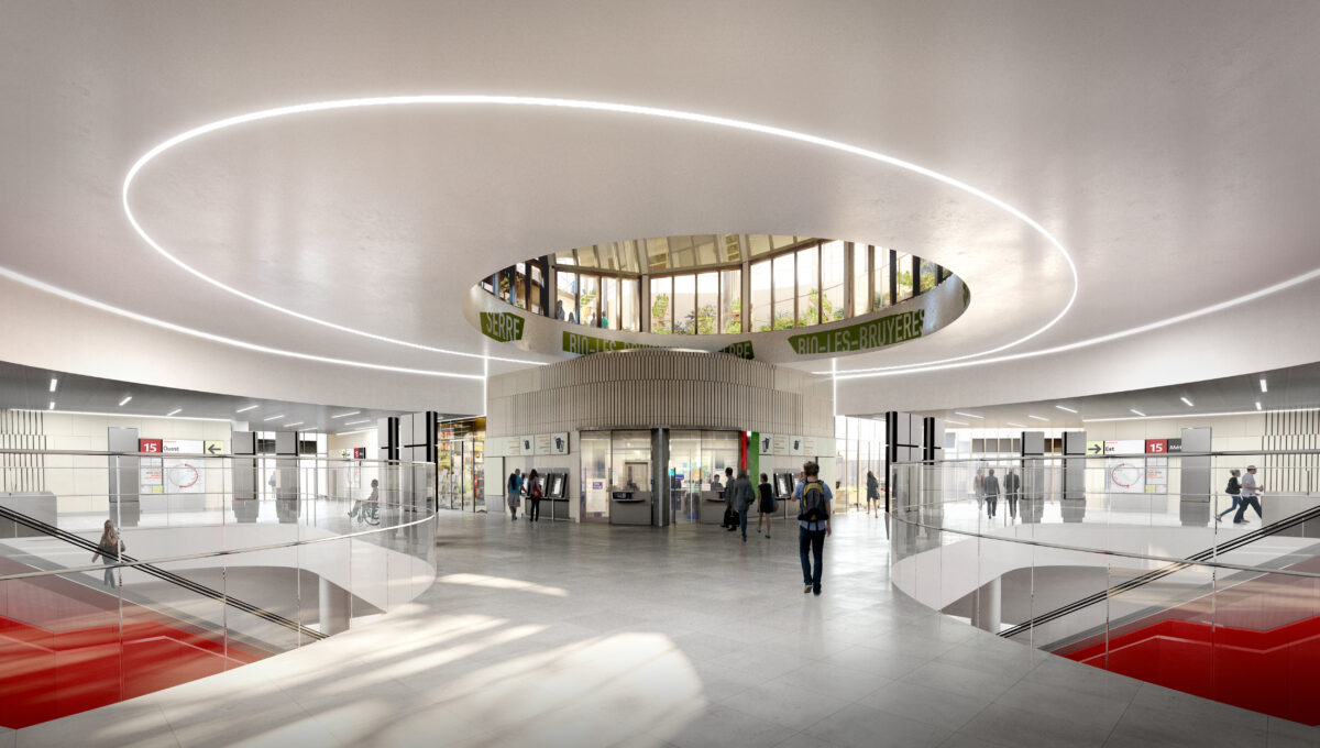 Elle jouxte la gare existante avec laquelle elle est mise en relation grâce à une passerelle enjambant les voies SNCF. En gageant ses quais à 36 mètres de profondeur par un puits circulaire de 57 mètres de diamètre, la gare se partage sur 5 niveaux : deux en surface et trois en sous-sol. Elle couvre 12.000m² auxquels s’ajoutent sur le toit 2.300 m² de serres en agriculture urbaine.