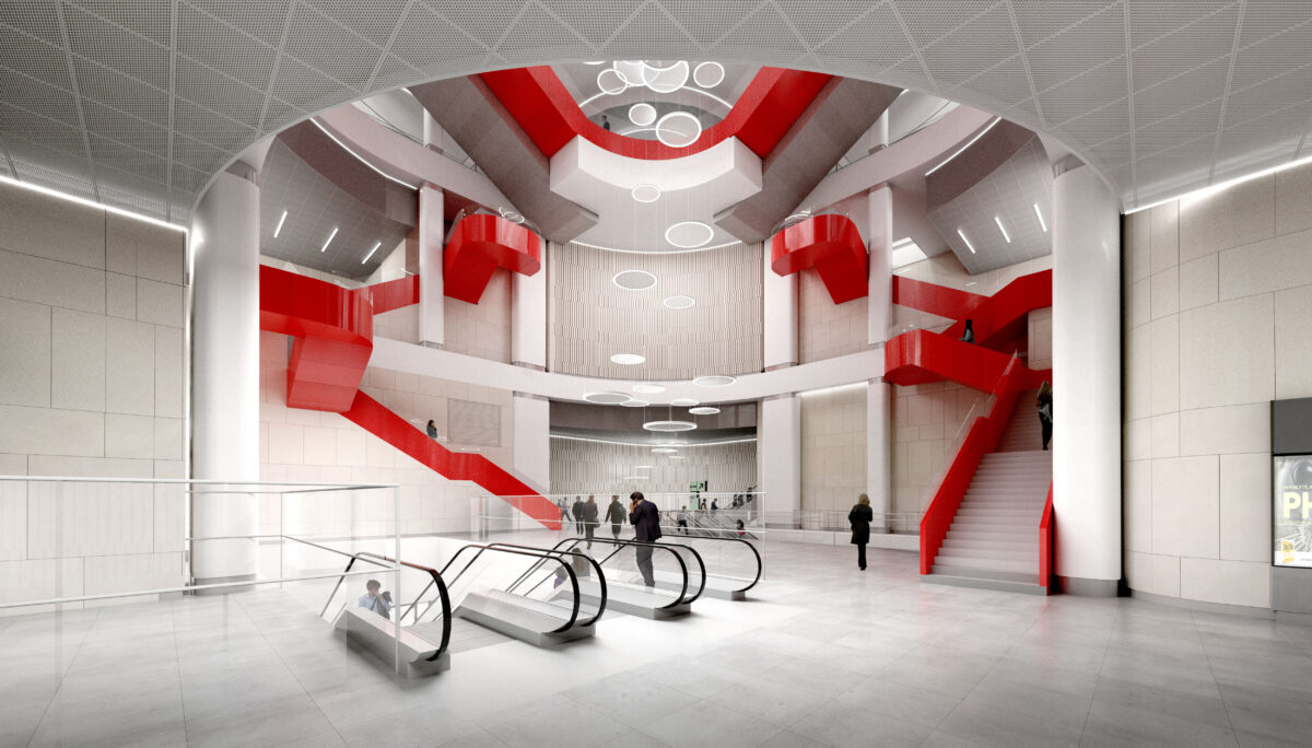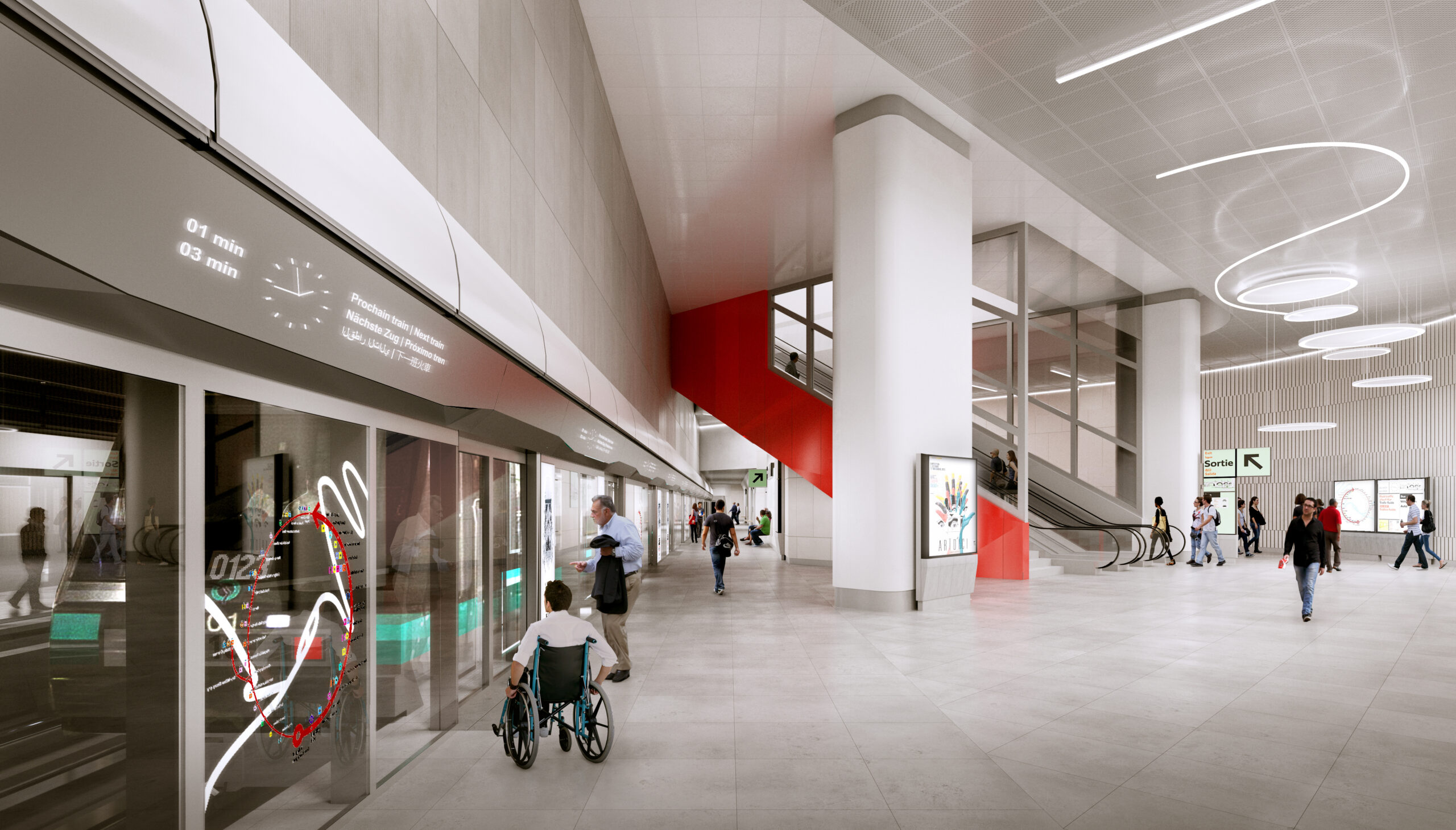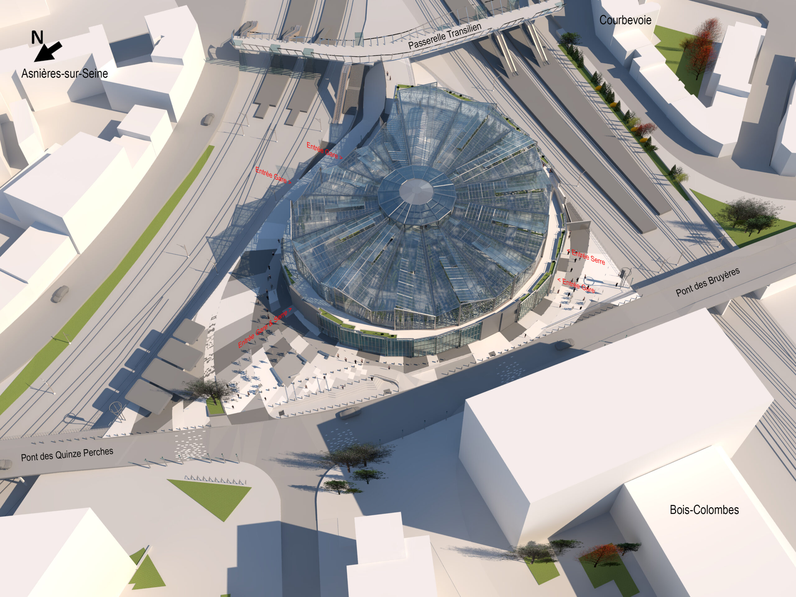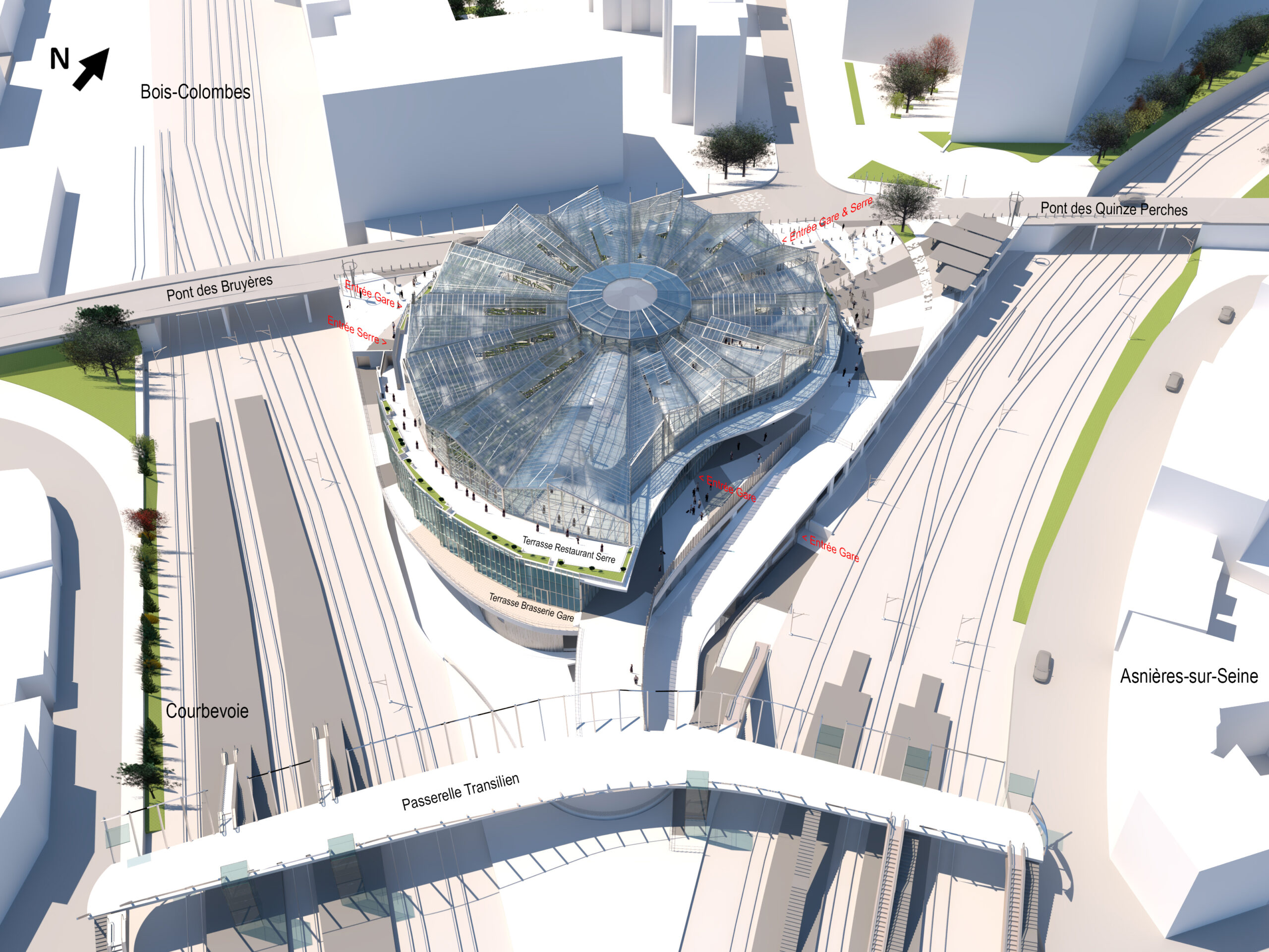 Elle jouxte la gare existante avec laquelle elle est mise en relation grâce à une passerelle enjambant les voies SNCF. En gageant ses quais à 36 mètres de profondeur par un puits circulaire de 57 mètres de diamètre, la gare se partage sur 5 niveaux : deux en surface et trois en sous-sol. Elle couvre 12.000m² auxquels s’ajoutent sur le toit 2.300 m² de serres en agriculture urbaine.