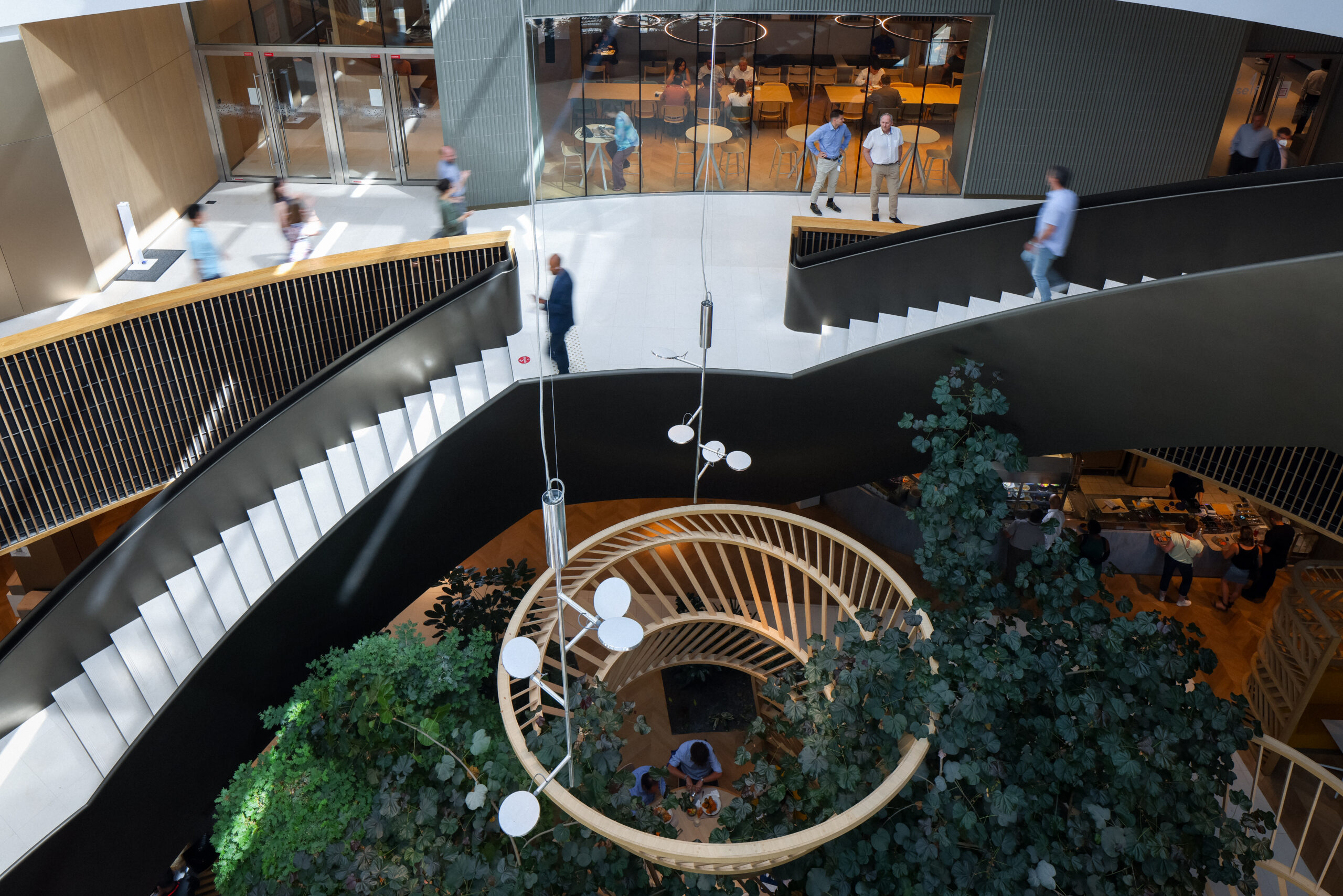 Le surplomb des deux bâtiments côté ouest qui reprend une charge très importante, ne repose en effet que sur 13 poteaux bipodes en « V » inversés. A terme, près de 4 000 collaborateurs de VINCI emménageront à l’archipel, rassemblant ainsi les fonctions centrales de tous les pôles de métiers du Groupe.