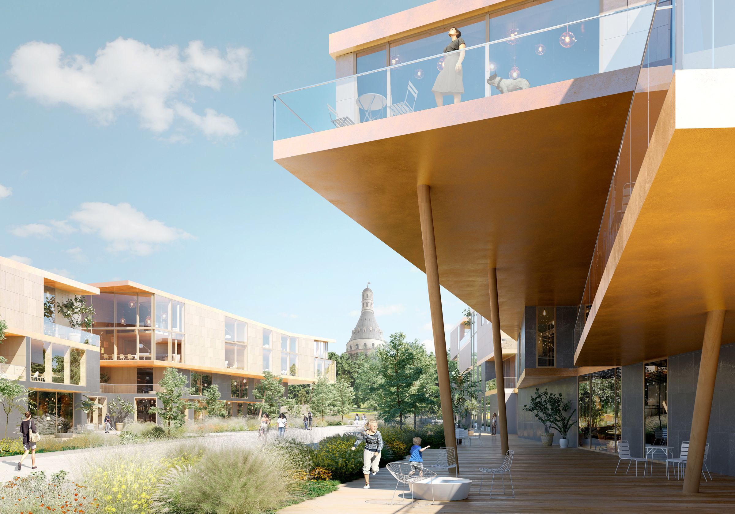 Dans les angles inclinés des lignes de toit, les terrasses et les jardins d’hiver créent des poches de verdure pour les appartements. Ces espaces verts de niveau supérieur font remonter le paysage dans les bâtiments. Les formes architecturales et l’aménagement paysager se fondent l’une dans l’autre, faisant ainsi éclater les limites entre l’espace intérieur et l’espace extérieur.